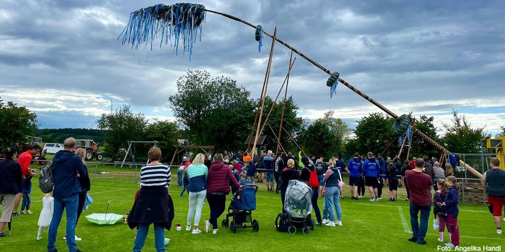 Mit etwas Verzögerung aufgrund eines starken Regenschauers verfolgten viele große und kleine Zuschauer das Geschehen aus sicherer Entfernung. Unter dem Kommando von Zimmerermeister Heinrich Kuck und vieler Manneskraft der Beucherlinger, war der Baum nach etwa einer Stunde in die Senkrechte gebracht. Die Kirtadearndln verteilten nach getaner Arbeit traditionell frische Küchl und kühle Getränke. „Kirchweih war früher das größte Fest im ganzen Jahr“, schrieb schon der bayerische Volksdichter Ludwig Thoma. Darum darf man nicht vergessen, warum man Kirta feiert, denn schließlich gäbe es diese Festlichkeit nicht ohne den Weihetag der örtlichen Kirche.