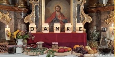 Der Erntealtar, vorbereitet von den Mitgliedern des Pfarrgemeinderates, wurde um die Gaben der Kinder ergänzt - wie z.B. um Sonne, Wasser, Kaffee, Tee, Reis Gewürze und exotische Früchte aber auch um Symbole für Familie und Freunde und das Zuhause.