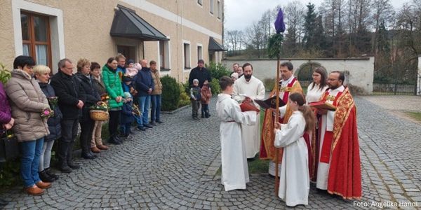 Dekan Ralf Heidenreich, Pfarrer Tinu und Pastoralreferent Thomas Probst begrüßten zum Beginn der heiligen Woche die Kommunionkinder mit ihren Eltern und alle Pfarrangehörigen am Sonntag dazu zuerst im Pfarrhof Zell. Dort wurden die selbstgebastelten Palmbuschen aus Buchs- und Weidenkätzchen mit Papierrosen wie vielen bunten Bändern, gesegnet. Danach zogen die Pfarrangehörigen mit der Geistlichkeit feierlich in der Pfarrkirche Mariä Himmelfahrt ein, begleitet von Fürbitten der Kommunionkinder.
