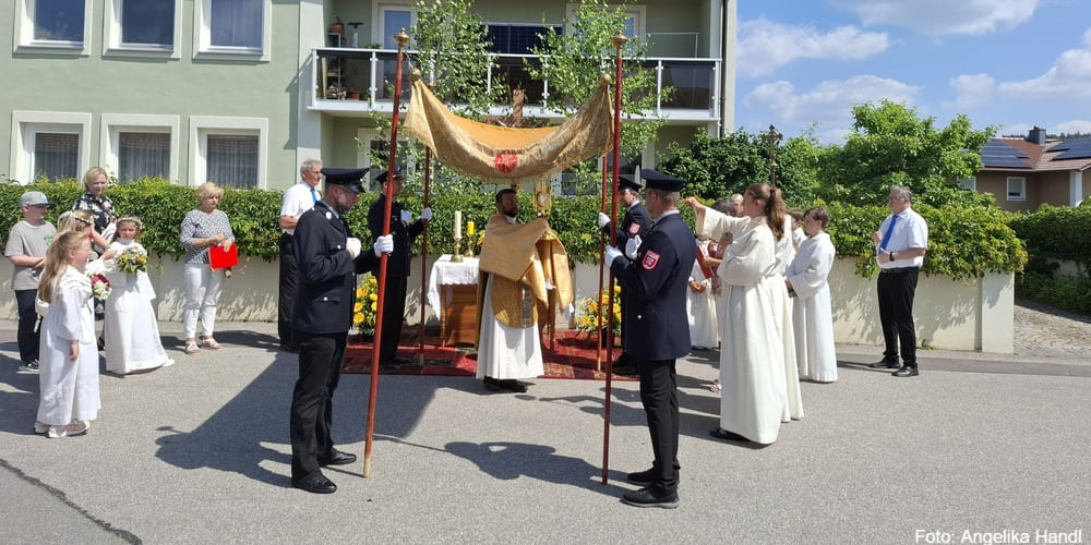 Die vier Altäre befanden sich bei der Schlossbrauerei Schwarzfischer, beim Feuerwehrgerätehaus, beim Kindergarten und bei der Familie Fries, neben der Schule und unweit der Pfarrkirche. Die Ehrenaufgabe des „Himmeltragen“ übernahmen vier Feuerwehrmänner von der FFW Zell, Feuerwehr Beucherling und FFW Hetzenbach. Der Pfarrer geht dabei geschützt unter dem Baldachin mit der Monstranz und dem Allerheiligsten, einer geweihten Oblate, bei der Prozession durch die Straßen mit. Daher kann man sagen – „der Herrgott zieht durch die Straßen“.