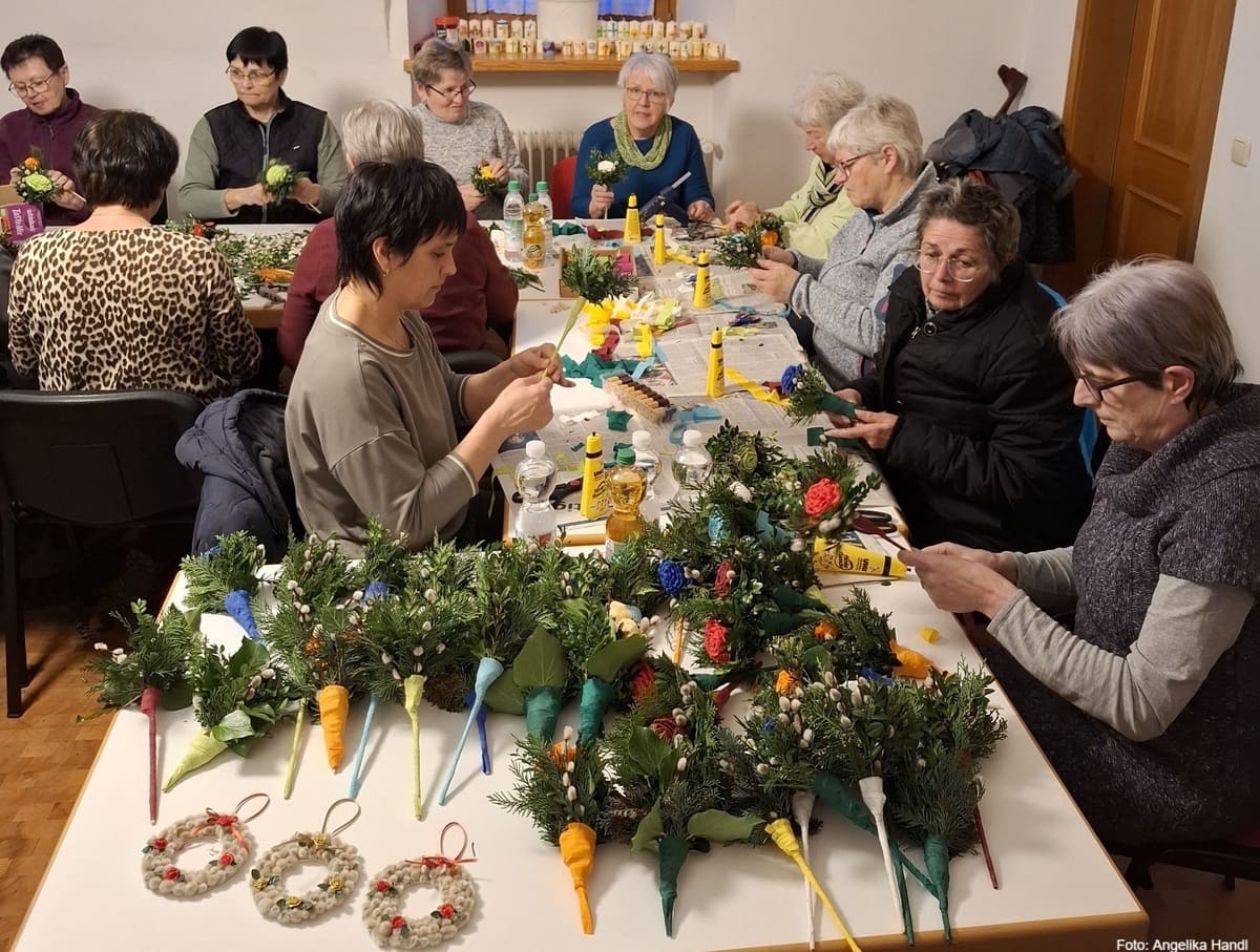 Nicht mehr lange und der Palmsonntag steht vor der Tür und somit auch bald das Osterfest. Voller Tatendrang waren viele fleißige Helferinnen vergangenen Montagabend dabei, um beim Binden und Gestalten der 280 Palmbüscherl und 28 Palmkranzerl mitzuhelfen. Bereits im Vorfeld waren etliche Damen damit beschäftigt mit viel Liebe und Geduld, die Röschen aus verschieden, farbigen Krepppapier herzustellen und erledigten somit schon mal viel Vorarbeit.